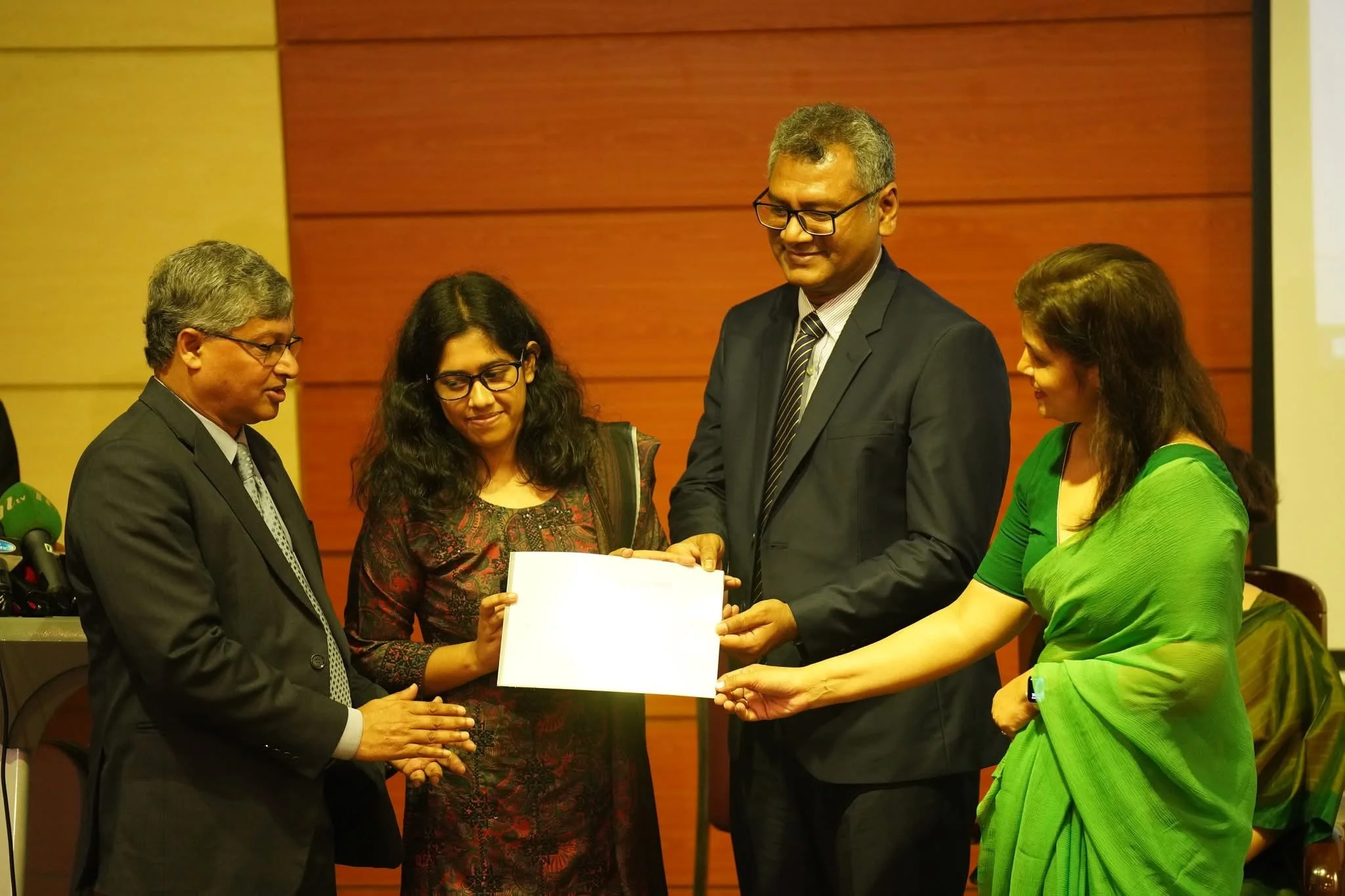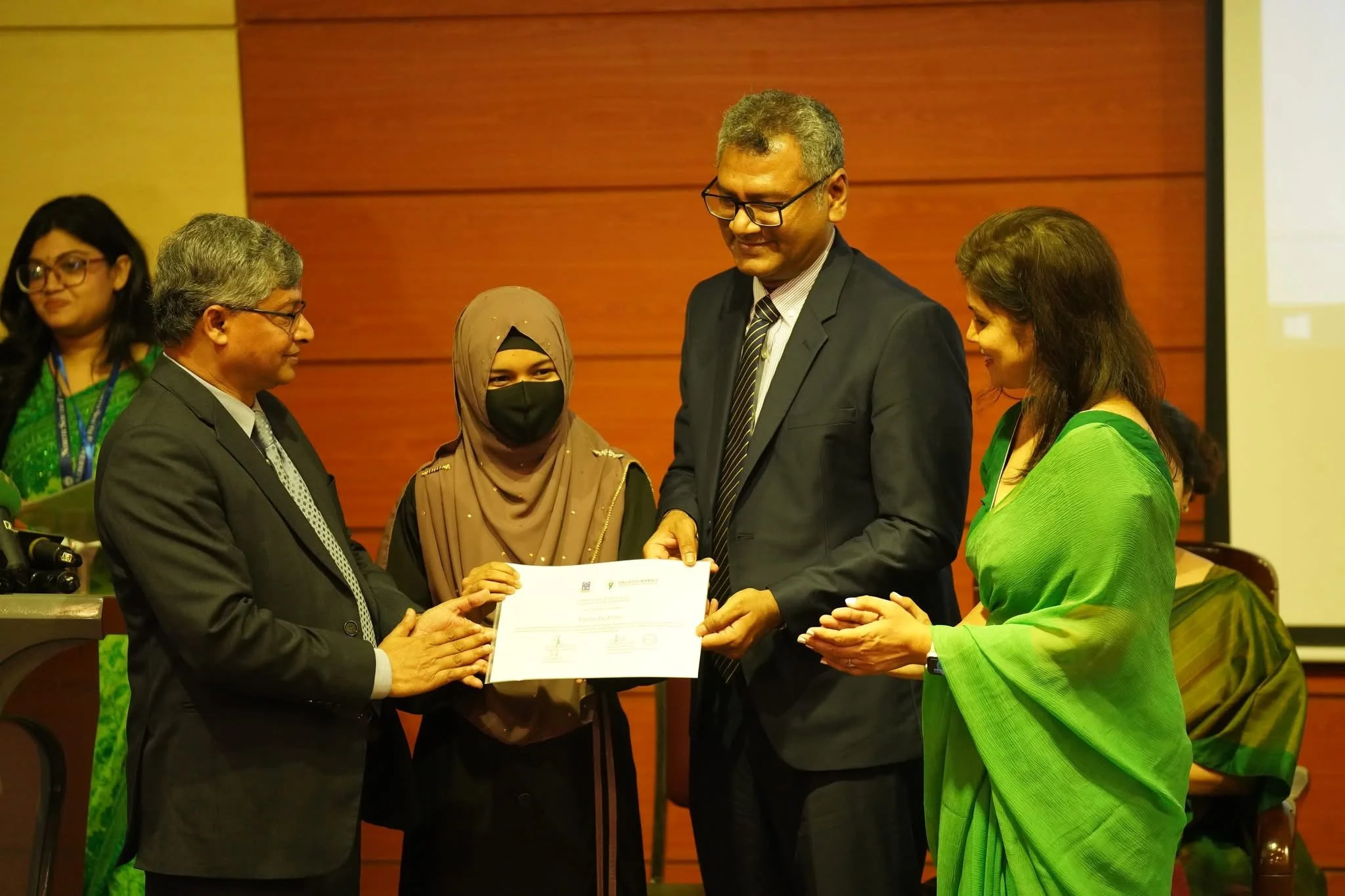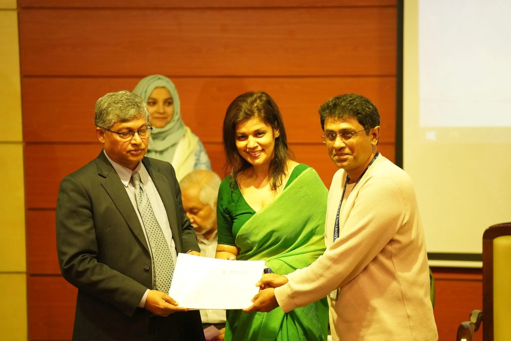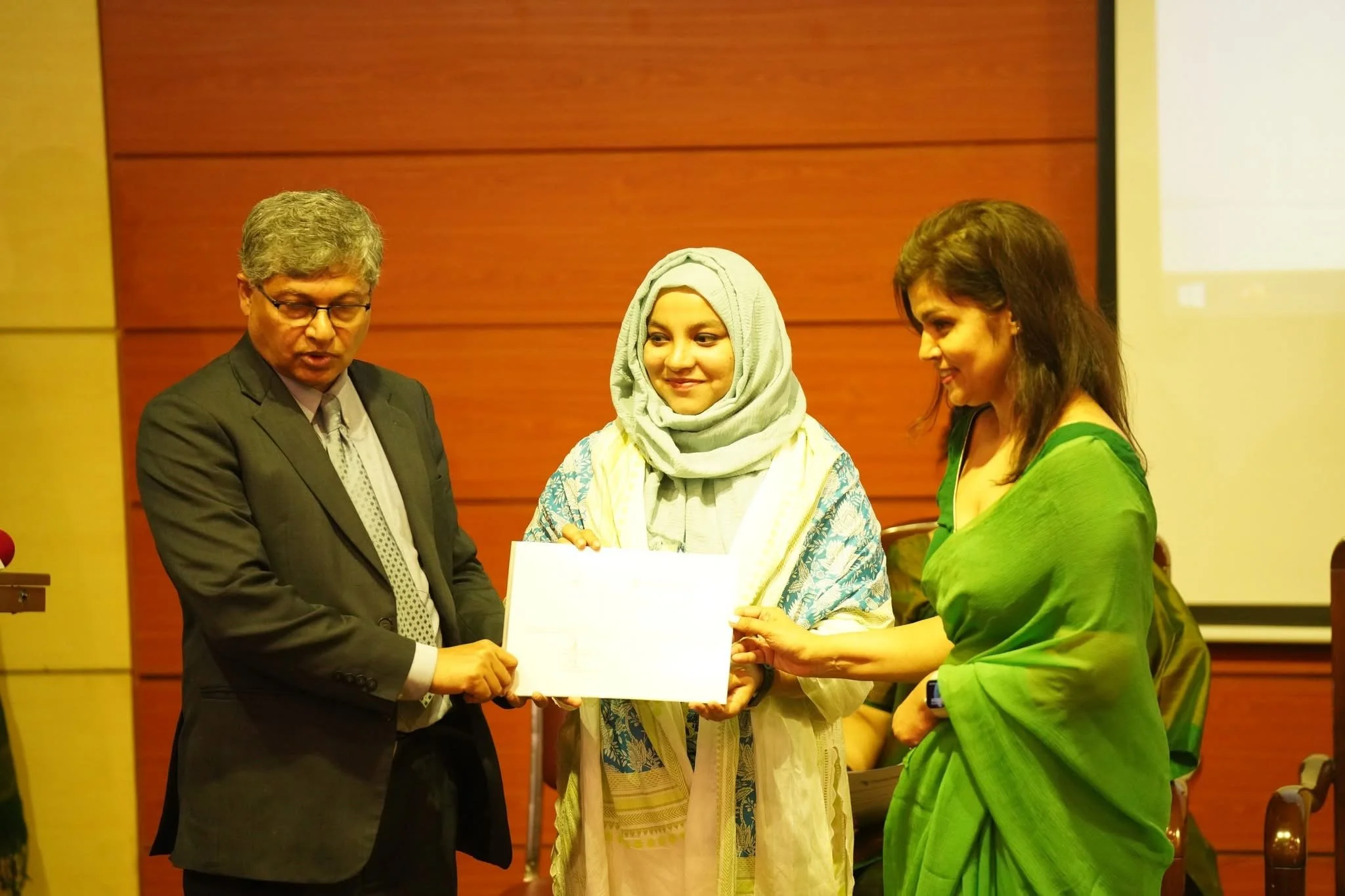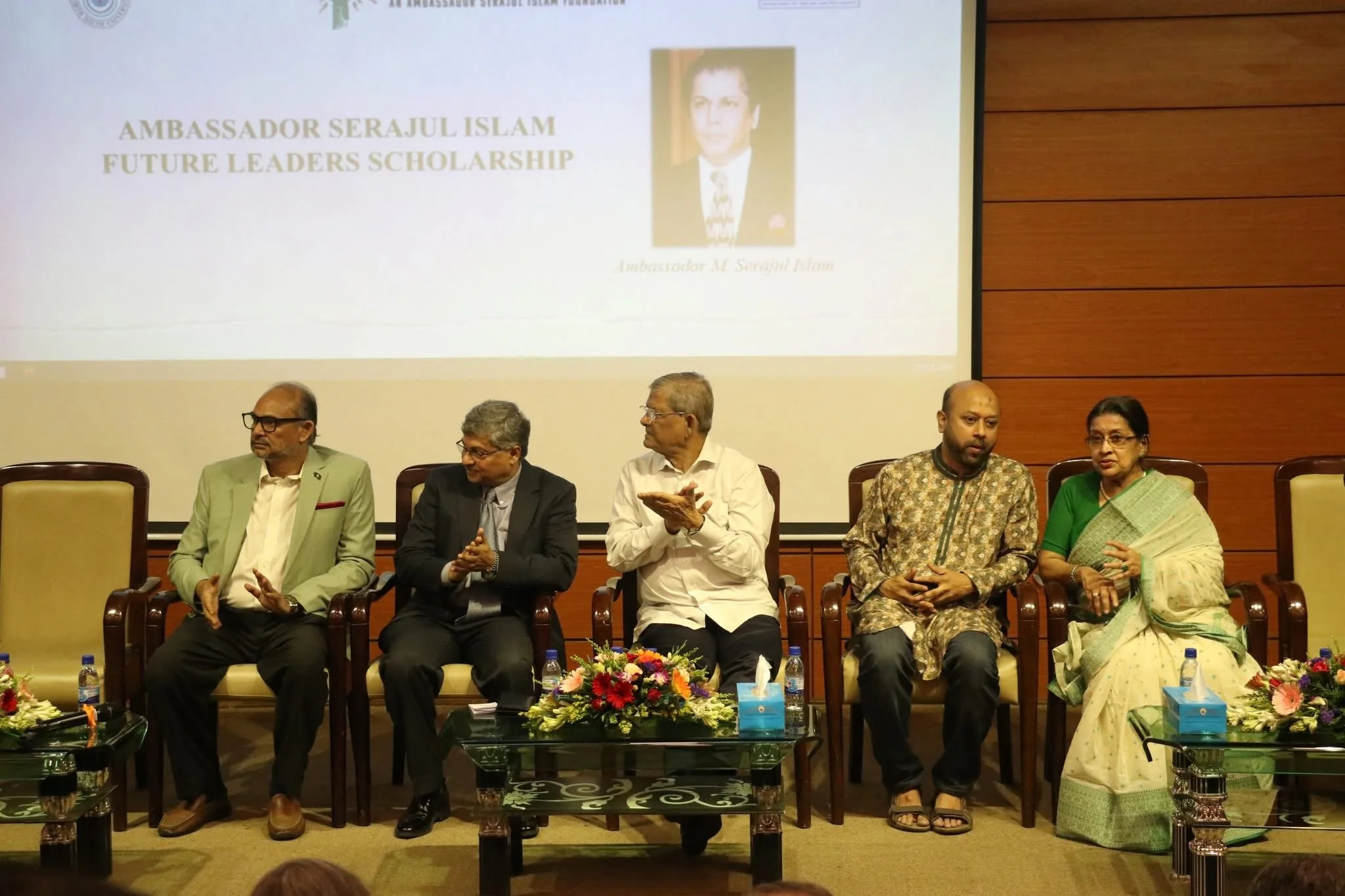 Speakers Mirza Fakhrul Islam Alamgir, Barrister Fuaad, and Mrs. Nasrin Fowzia—wife of Ambassador Serajul Islam—share a moment on stage during the Ambassador Serajul Islam Future Leaders Scholarship segment of the Empowering Bangladesh conference. Behind them, a tribute to Ambassador Islam underscored the enduring impact of his legacy on the next generation of leaders. (Photo Credit: Fuaad Abdullah)