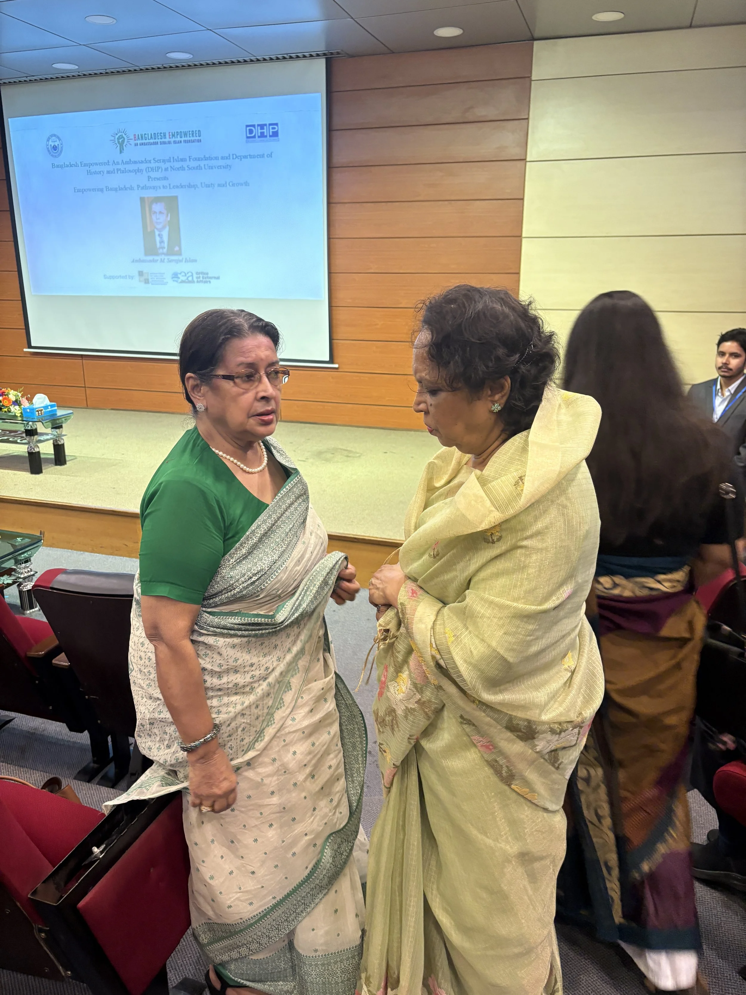 Dr. Saleh Shahriar of North South University and Barrister Asaduzzaman Fuaad of the Amar Bangladesh (AB) Party connect at the Empowering Bangladesh conference. Both speakers, long inspired by Ambassador Serajul Islam’s calls for institutional reform, shared thought-provoking perspectives on governance, foreign relations, and Bangladesh’s democratic future. Their exchange captured the spirit of the day—bridging academia and advocacy to envision a stronger, more accountable nation.