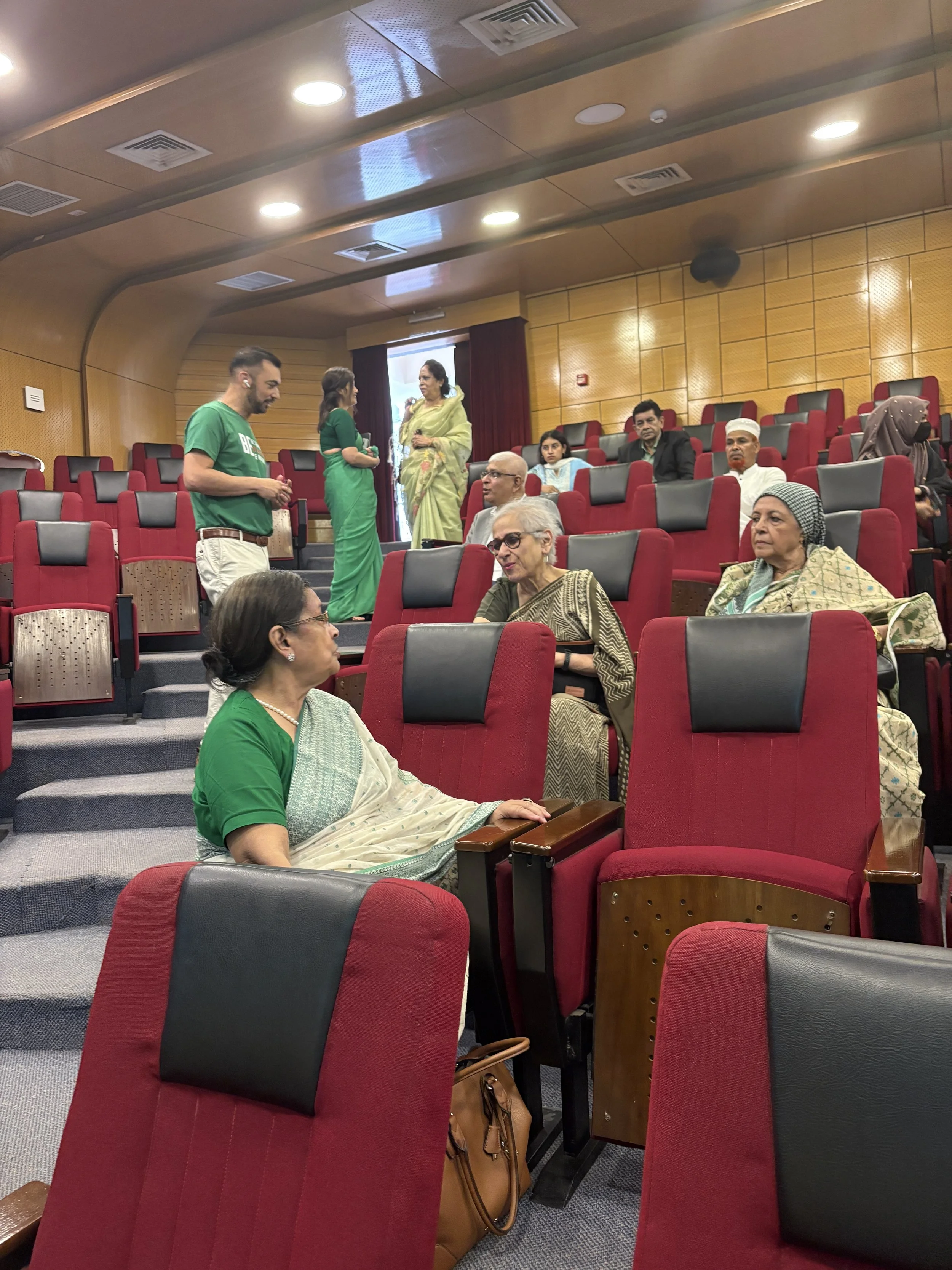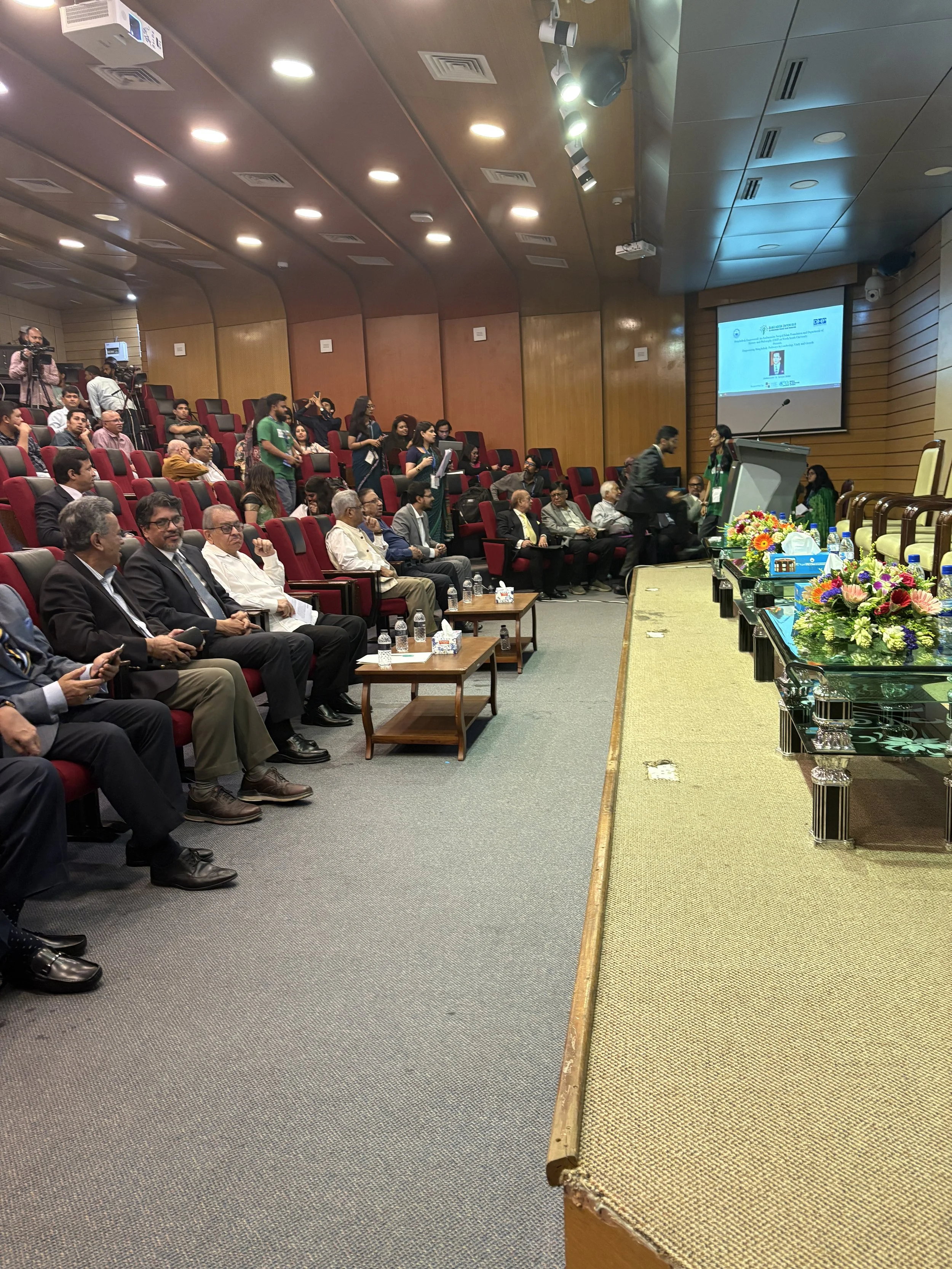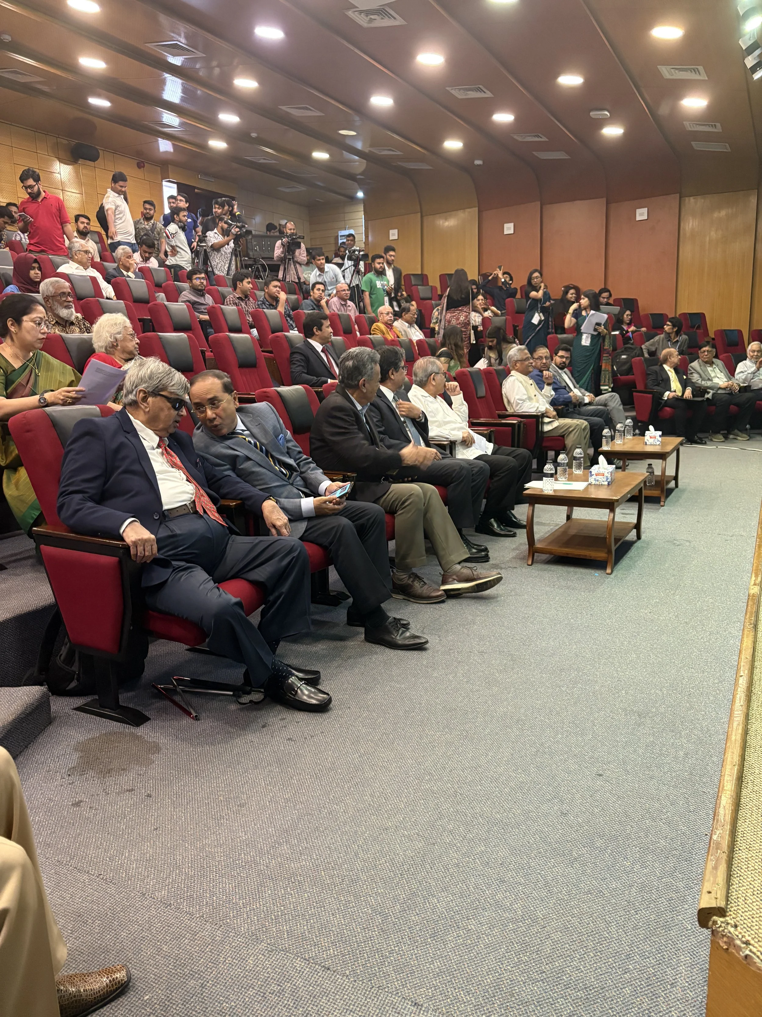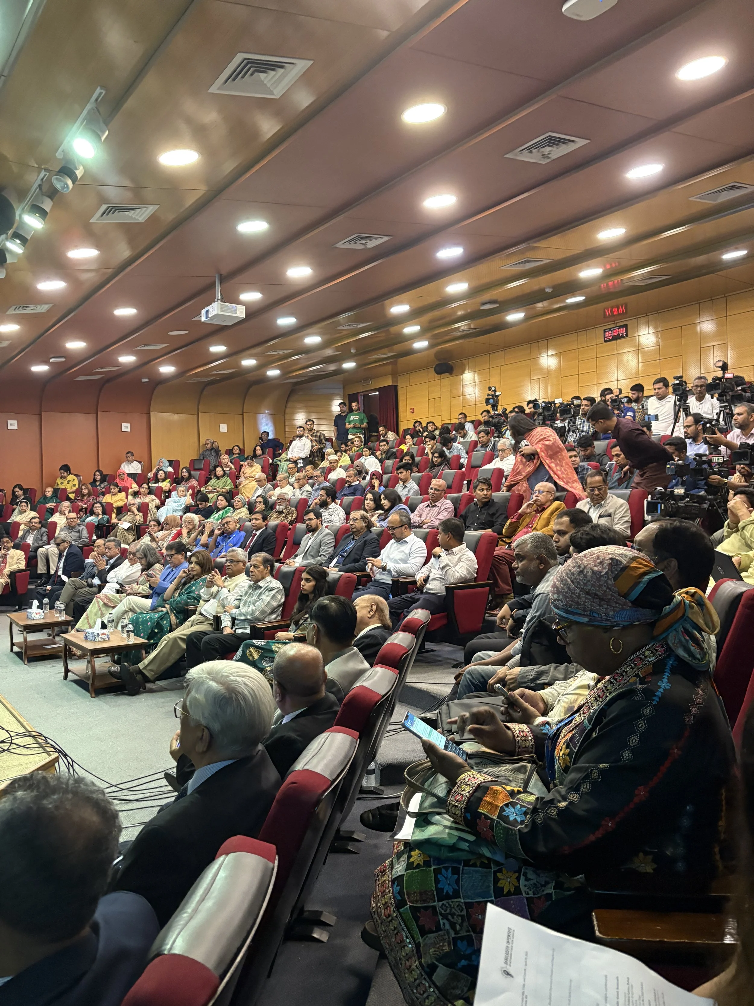A candid moment with speakers, conference organizers, and family members capturing the energy and excitement before the start of the Empowering Bangladesh conference. The full auditorium, packed with attendees, press, and supporters, reflected the powerful sense of community and commitment to shaping a brighter future for Bangladesh.